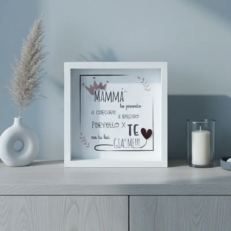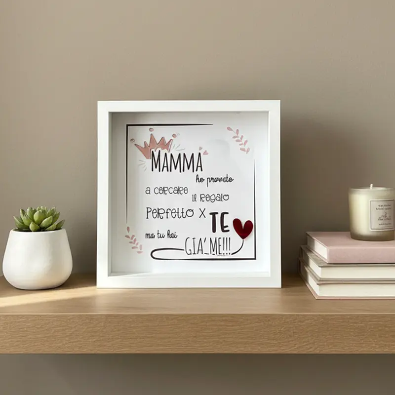 La cornice è in legno bianco, con dimensioni 25x25x6 cm perfetta per stare in piedi da sola su mensole e scrivanie senza occupare troppo spazio. La stampa è su MDF bianco ad alta qualità, con dettagli in plexiglass specchio che aggiungono quel tocco in più che si nota subito. Non è una cornice qualsiasi. Si vede che è fatta con cura, che dietro c’è attenzione al dettaglio. Ed è esattamente quello che cerca chi vuole regalare qualcosa di bello, non solo di utile. Perché tua mamma merita un regalo che la faccia sentire speciale — non uno qualsiasi preso di corsa.