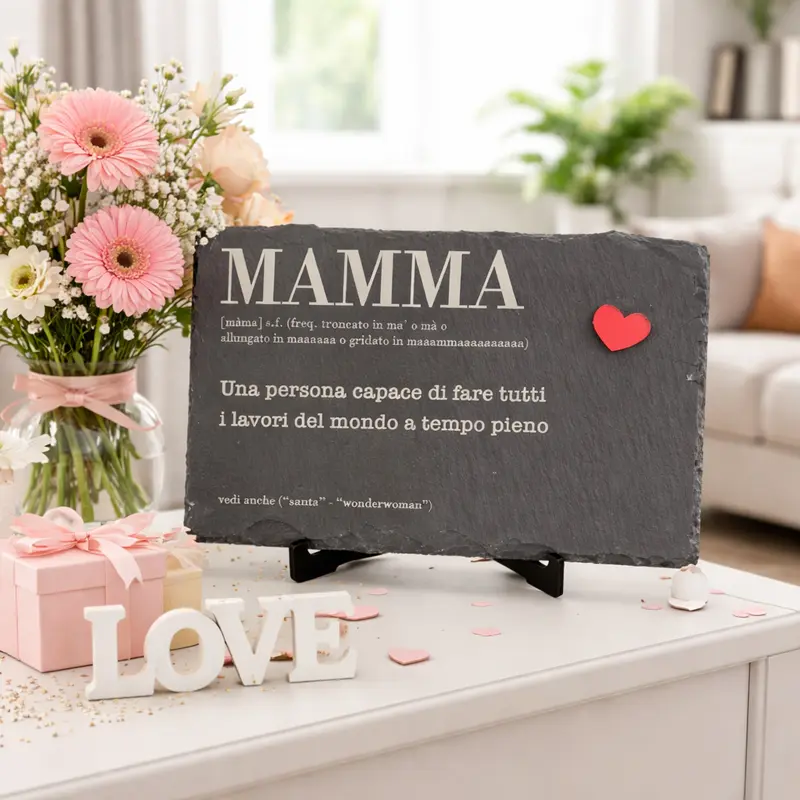 Trovare il regalo giusto per la mamma non è sempre facile. Vuoi farla sorridere e ringraziarla per il suo lavoro a tempo pieno. Questa targa è l’idea regalo originale mamma che stavi cercando. La pietra riporta una definizione ironica e affettuosa. È un pensiero semplice, diretto e fatto per durare. Un’ottima idea regalo festa della mamma per evitare i soliti oggetti e regalarle un’emozione sincera.