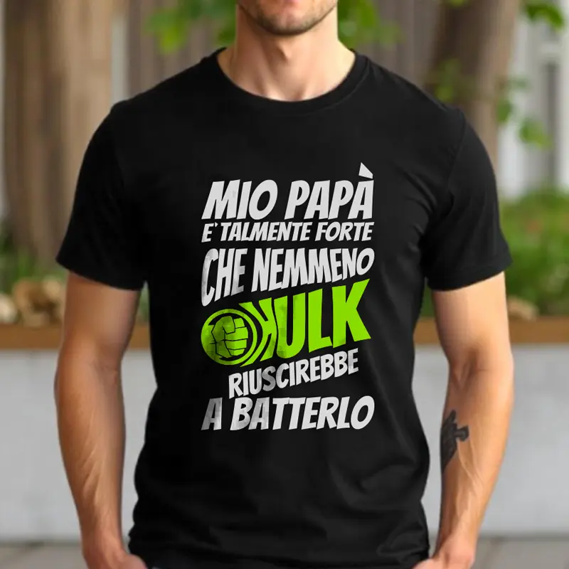 Questa maglia ha un messaggio molto chiaro. C’è scritto: “Mio papà è talmente forte che nemmeno Hulk riuscirebbe a batterlo”. È una frase ad effetto. Riprende il famoso pugno verde che rompe ogni cosa.
