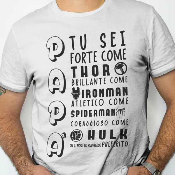Maglietta “Super Papà  Super Eroi” classica, divertente, da indossare subito.